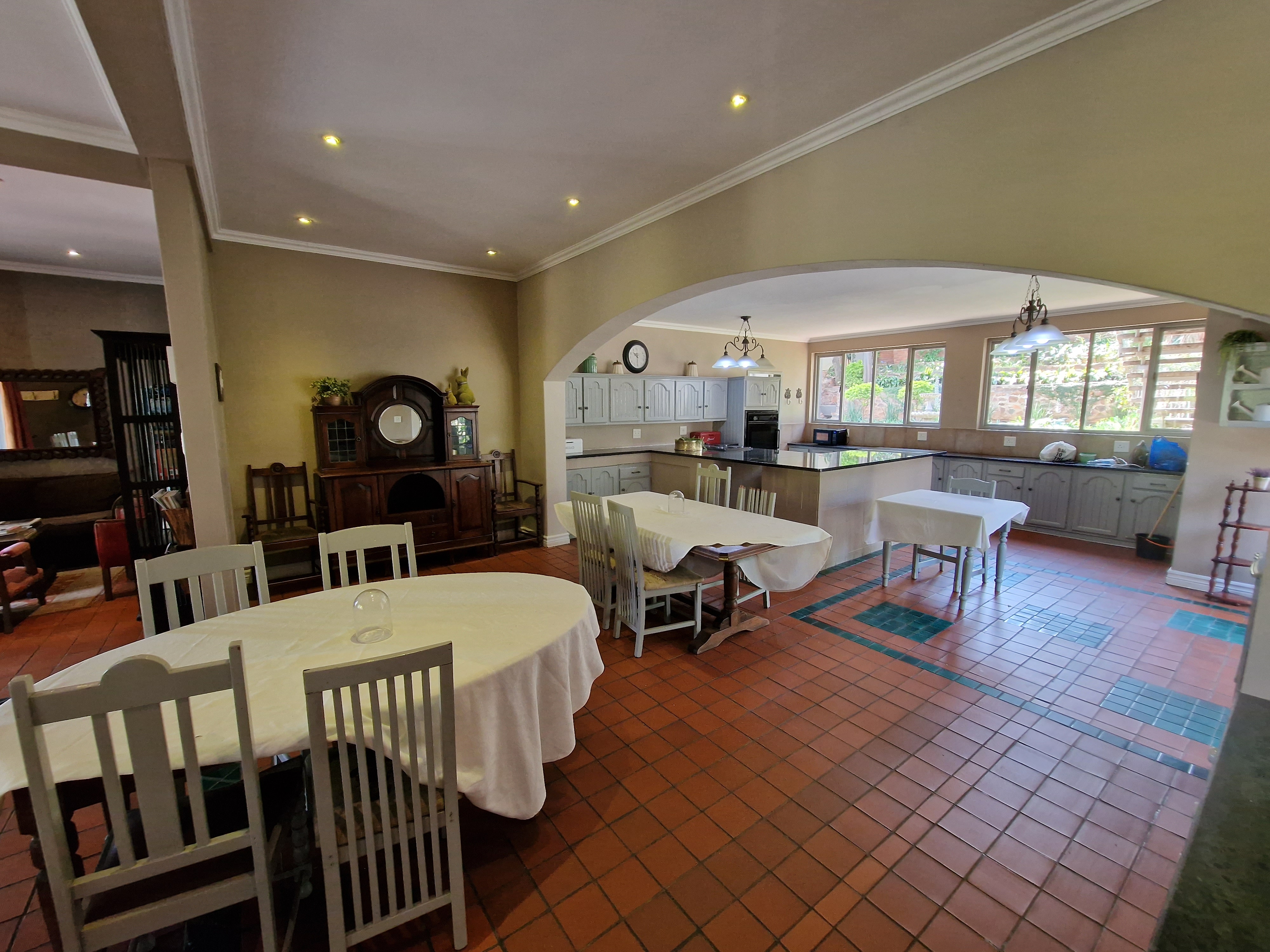 The heart of the home is an expansive open-plan kitchen flowing seamlessly into a spacious dining area, ideal for hosting guests or private functions. With its tranquil setting, separate staff accommodation, and secure on-site parking, this exceptional property offers everything needed for a comfortable stay and a successful hospitality venture.