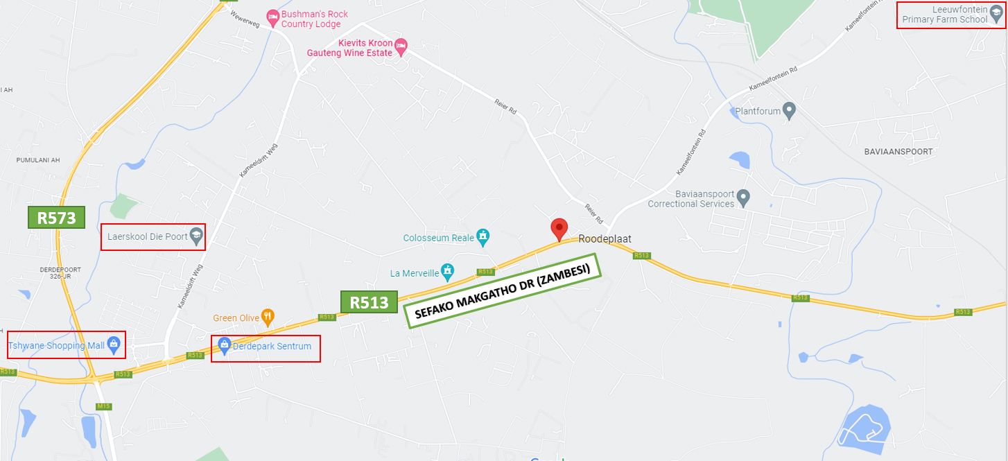 This 8.5Ha stand is strategically positioned on the R513 Zambesi / Sefako Makgatho Drive, just 5 km from the N1 Highway and minutes from Mamelodi West.